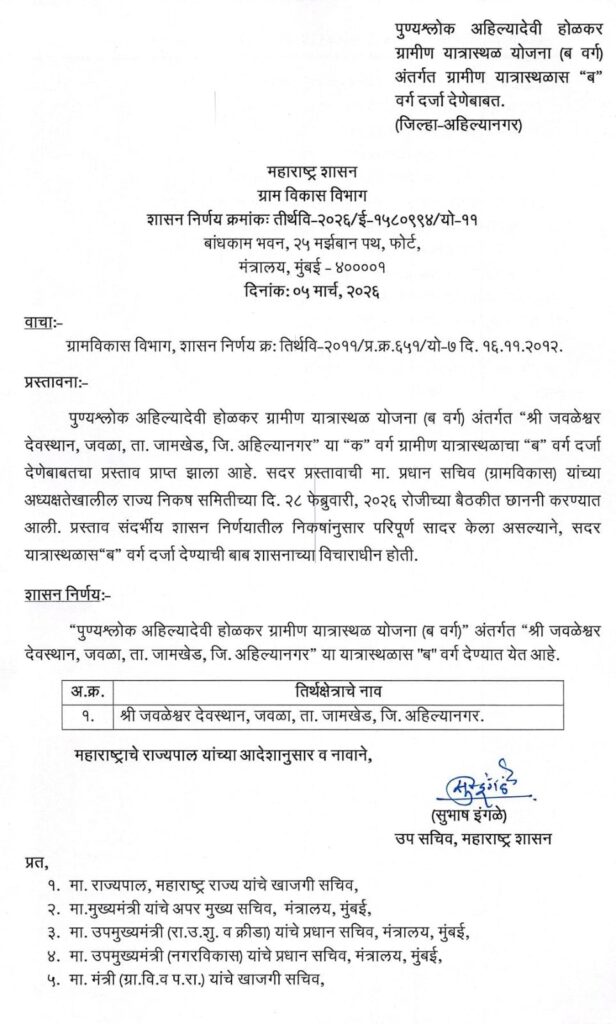जामखेड : जामखेड तालुक्यातील जवळा येथील प्रसिद्ध श्री जवळेश्वर देवस्थानाला राज्य शासनाच्या पुण्यश्लोक अहिल्यादेवी होळकर ग्रामीण यात्रास्थळ योजना अंतर्गत ‘ब’ वर्ग ग्रामीण यात्रास्थळाचा दर्जा देण्यात आला आहे. ग्रामविकास विभागाने दि. ५ मार्च २०२६ रोजी यास अधिकृत मान्यता दिल्याने या देवस्थान परिसरातील विकासकामांना आता गती मिळणार आहे.
